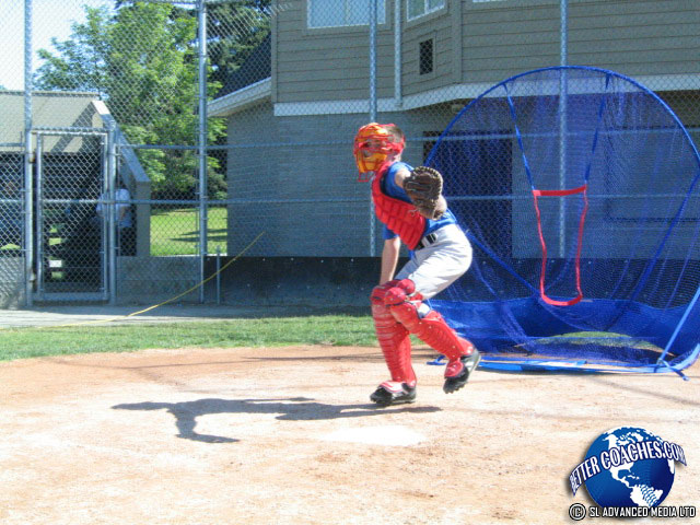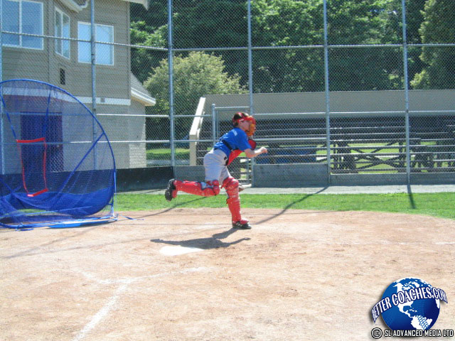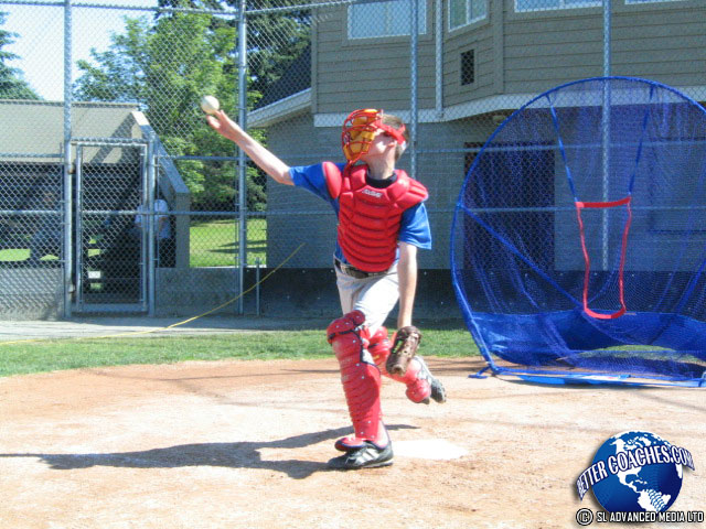 Proper Footwork: for a catcher, gaining momentum and using your legs is just as important as having a good arm motion. Basically, in one motion a catcher needs to gain forward momentum and square up their shoulders to effectively release an accurate, powerful throw. There should be slightly different footwork involved with different pitch locations. With a pitch to the left, a catcher needs to slightly kick his right leg out behind and to his left while moving forward. This will square up his shoulders and still give him the power to push off his back leg for a good throw. The same is true with a pitch down the middle of the plate, except that the right leg can be kicked directly behind the catcher while moving forward. With a pitch to the right, the right leg should be planted and act as a swivel or pivot to turn and throw off of. A pitch low and to the right is the hardest pitch to throw runners out on. To throw a runner out at third, with a right handed batter at the plate, the catcher has two options: If the pitch is inside it is best to kick out the right leg behind the batter and throw behind him. If the pitch is outside it is often best to kick the right leg straight ahead and throw in front of the batter. This takes practice and eventually becomes a personal preference for the catcher.