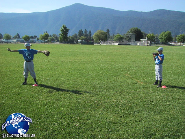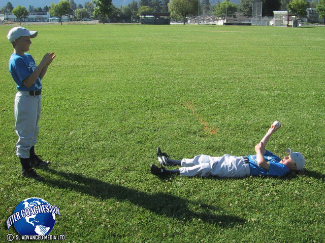 Divide players into partners and line them up along one of the foul lines. Players should be positioned 5-10 feet apart depending on arm strength. One partner lays down (using their glove as a head rest) while the other stands in front of them with a baseball...